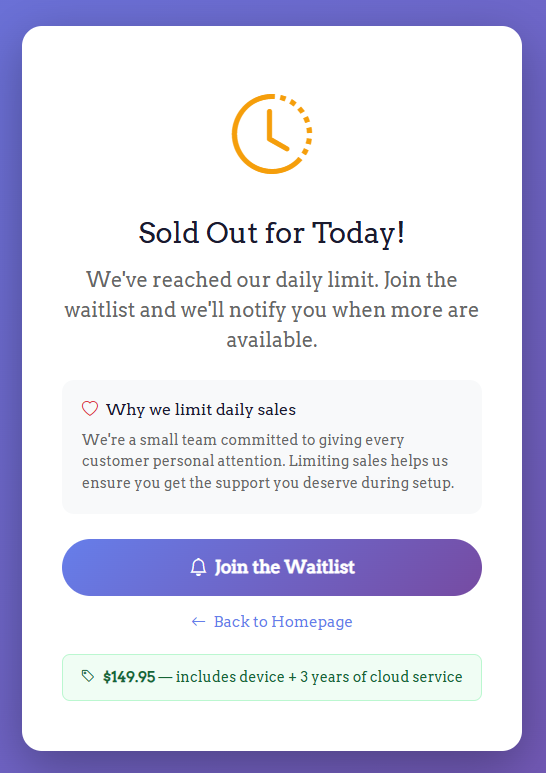 As we test some different marketing channels, we want to be sure not to sell more than we can support, or have on hand. The checkout system monitors a db with the daily amount not to excede.